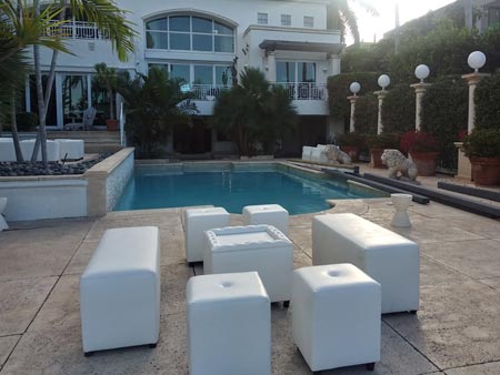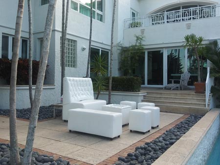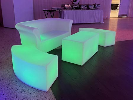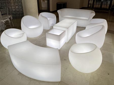 Stylish event furniture rentals featuring white leather lounges, LED glow seating, and modern cocktail sets – designed to elevate any celebration with comfort, elegance, and a vibrant touch